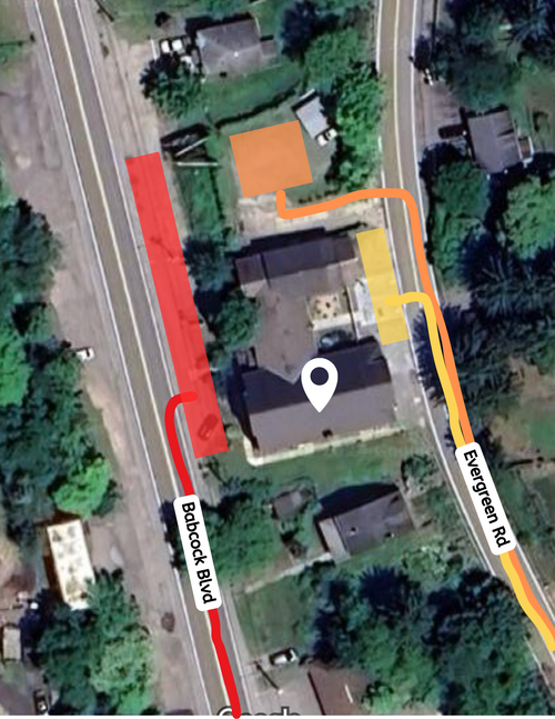 There are a limited number of senior and handicap parking spaces (yellow) right outside the front entrance off of Evergreen Road. Slightly beyond those spaces, there is a small lot (orange) to the left for families with young children. We ask that all others park in the spaces (red) in front of Sunken Bus off of Babcock Boulevard. Look for our Pursuit Church sidewalk sign to guide you to stairs that will take you around the right side of the building to the entrance.